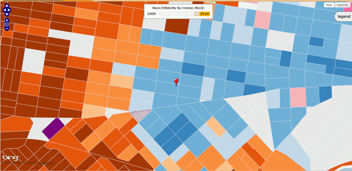 You can see that the number of white people in my neighborhood has increased dramatically over the past ten years. The boundary between the majority white area and majority black area has moved approximately two blocks to the west.